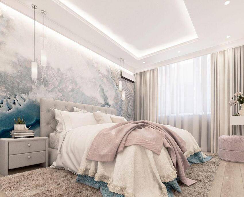 Однако пастельный дизайн интерьера нередко сильно зависит от освещения. При хорошем свете в реальности и на фото такая спальня может выглядеть светлой просторной, а в полумраке она становится мрачной, унылой и даже грязноватой. Чтобы избежать этого, пастель не стоит совмещать с сочными яркими акцентами. И не забываем вдумчиво продумать точеную подсветку.