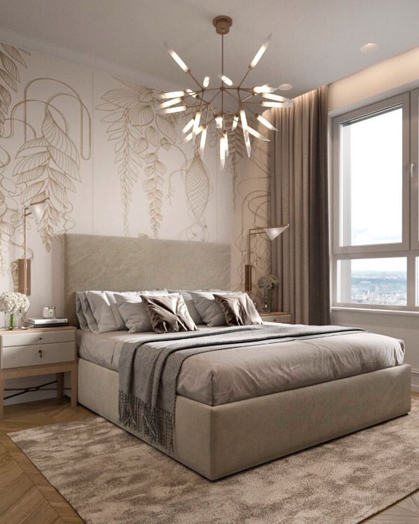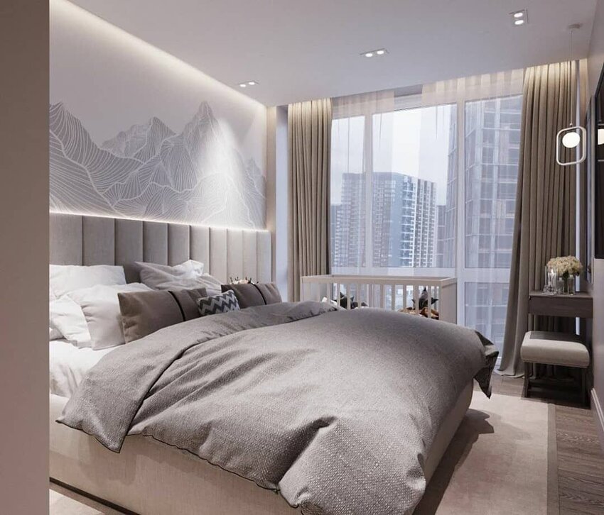 Есть еще один прием, помогающий освежить и немного зрительно расширить пространство спальни в современном стиле на 12 кв. м. Это использовать необычные фотообои. Тем более даже необязательно их покупать, требуется только заказать печать по своему выбору. Природные ландшафты или снимки мегаполиса, как на фото, сделают комнату просторнее и принесут много света и воздуха.