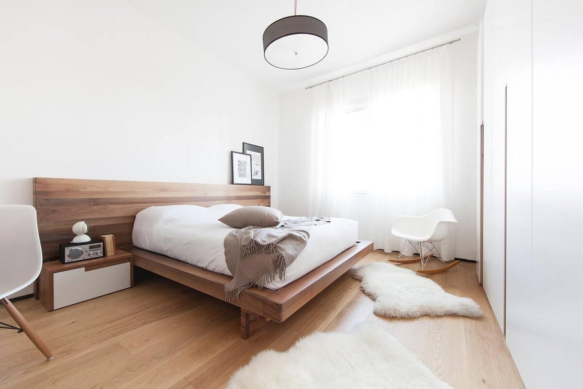 Минимализм. Главное отличие минималистического дизайна спальни 17 кв. м заключается в минимуме самых необходимых вещей. Причём в первую очередь, они должны быть практичными и функциональными. Также для данного направления свойственно отсутствие декора. От современной стилистики его отличает цветовое решение.