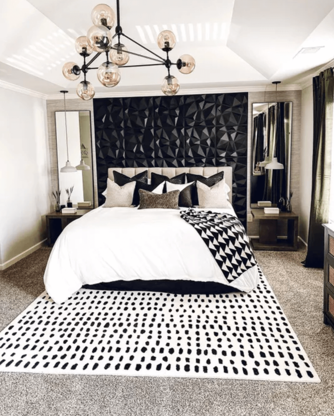 Что может быть лучше, чем зонирование обоями над кроватью? Фактурная отделка стен с трехмерным геометрическим рисунком. Этот декор на стене добавит гламура в спальню и выведет простое пространство на новый уровень.