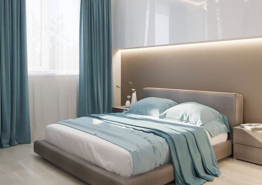 • Зеркальные поверхности и неяркий глянец на потолке – отличное решение для визуального увеличения высоты комнаты. Натяжные потолки прекрасно впишутся в маленькую спальню.