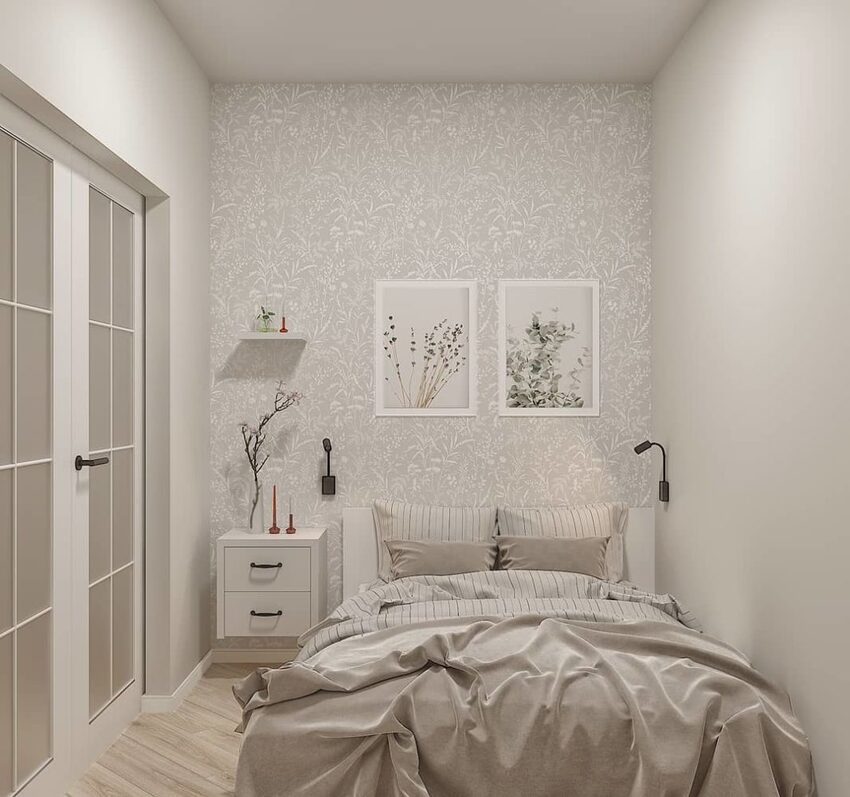 • Темная мебель и крупный принт обоев не уместны для маленькой спальни;