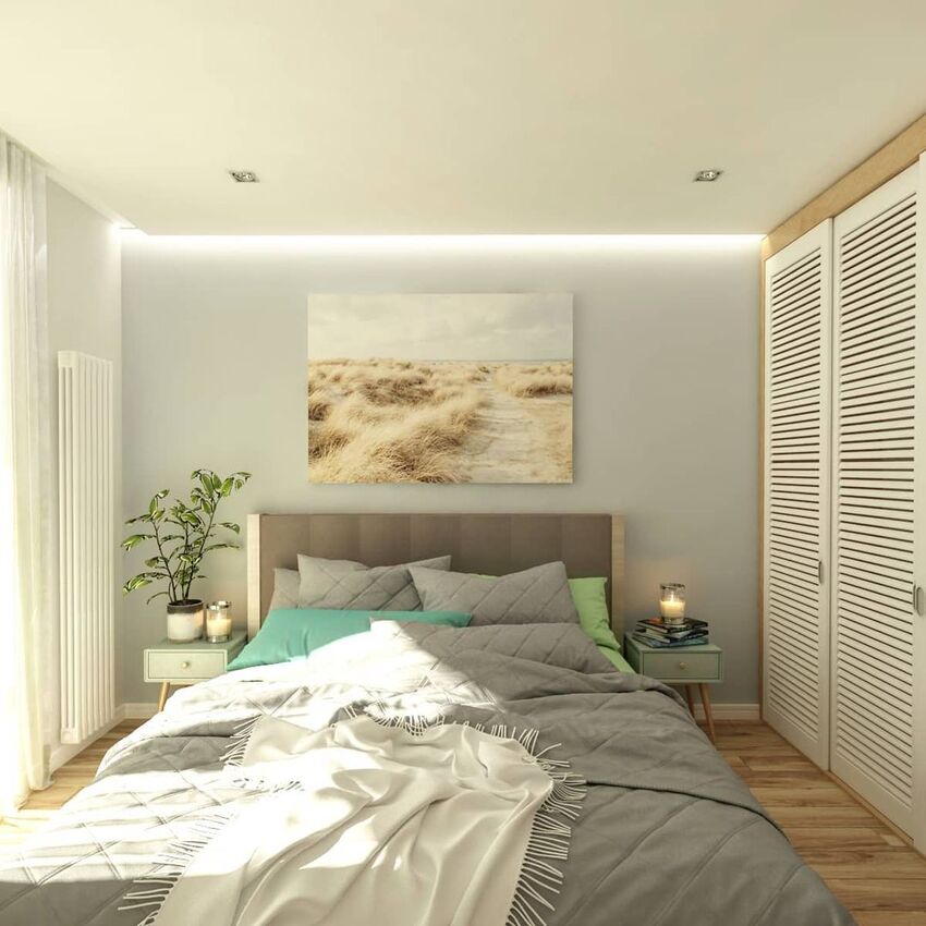 Маленькая спальня 21 века — это четкие графические линии, спокойные тона и никаких лишних предметов.