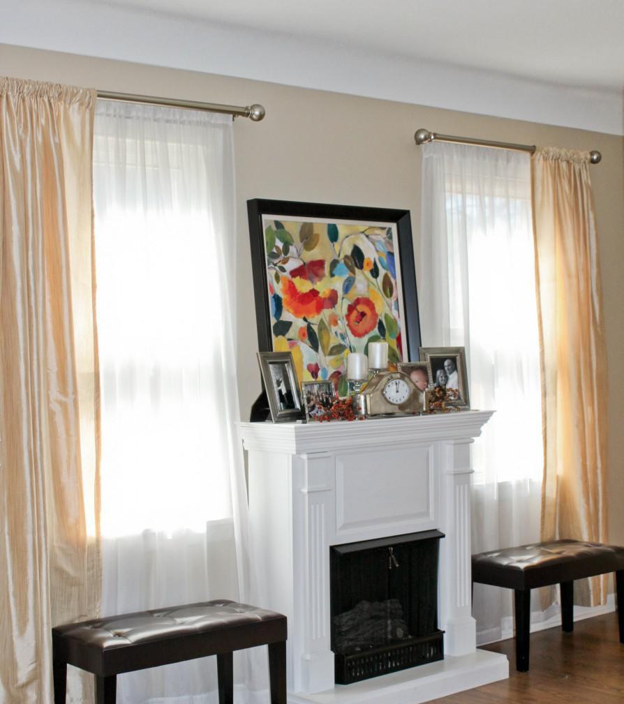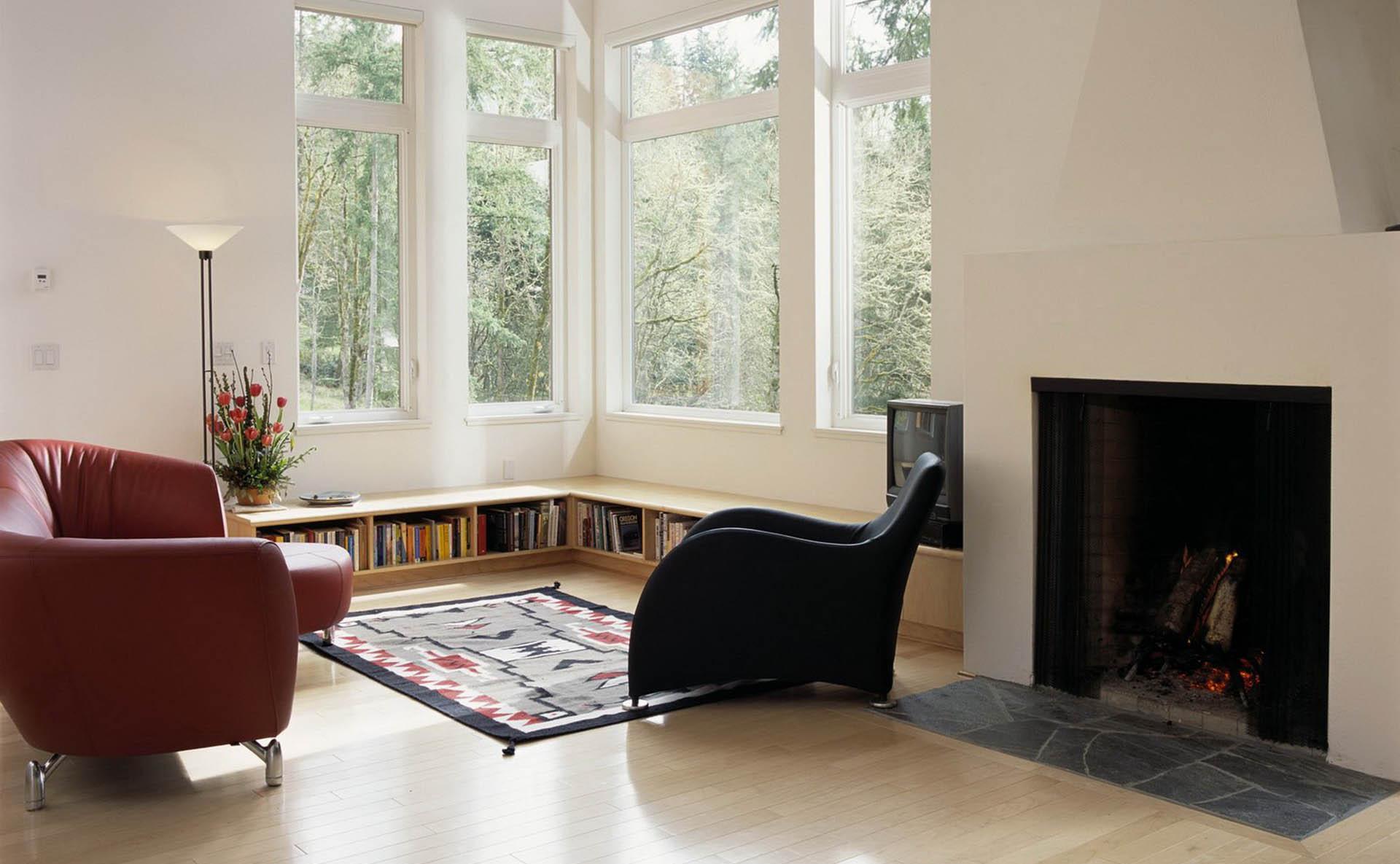 Камин между двумя окнами в гостиной