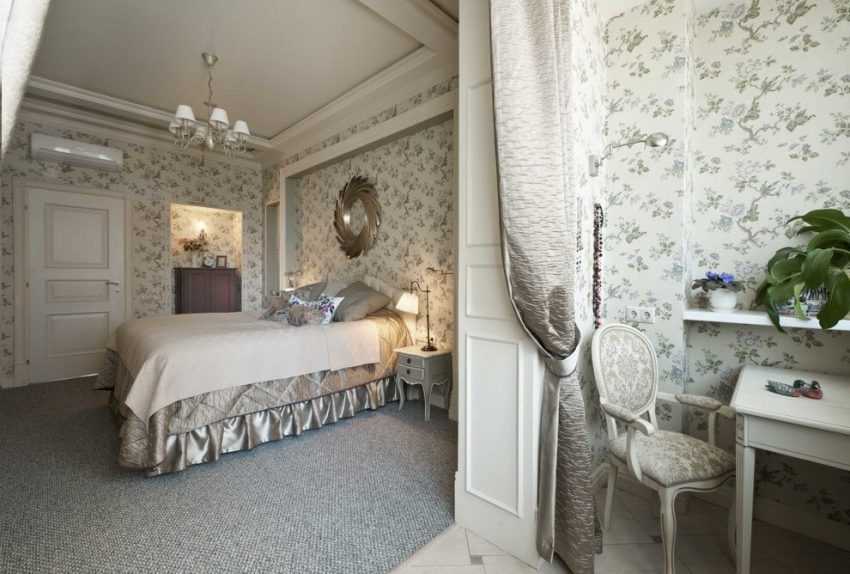 - выигрышно будет смотреться узкая стена у изголовья кровати, оформленная не так, как остальные. Можно наклеить на нее обои на пару оттенков темнее, обыграть мелким, витиеватым узором. Это внесет в интерьер нотки ретро и модерна, что и доказывают фото интерьеров;