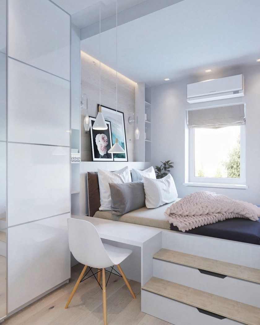 В маленькой спальне особенно актуальны кровати-подиумы, потому что во вместительные коробы поместится не только белье, но и другие вещи. Используй зеркала и стекло, которые визуально расширяют пространство. Стирай видимые границы и рисуй новые за счет отделки, акцентов и расстановки мебели.