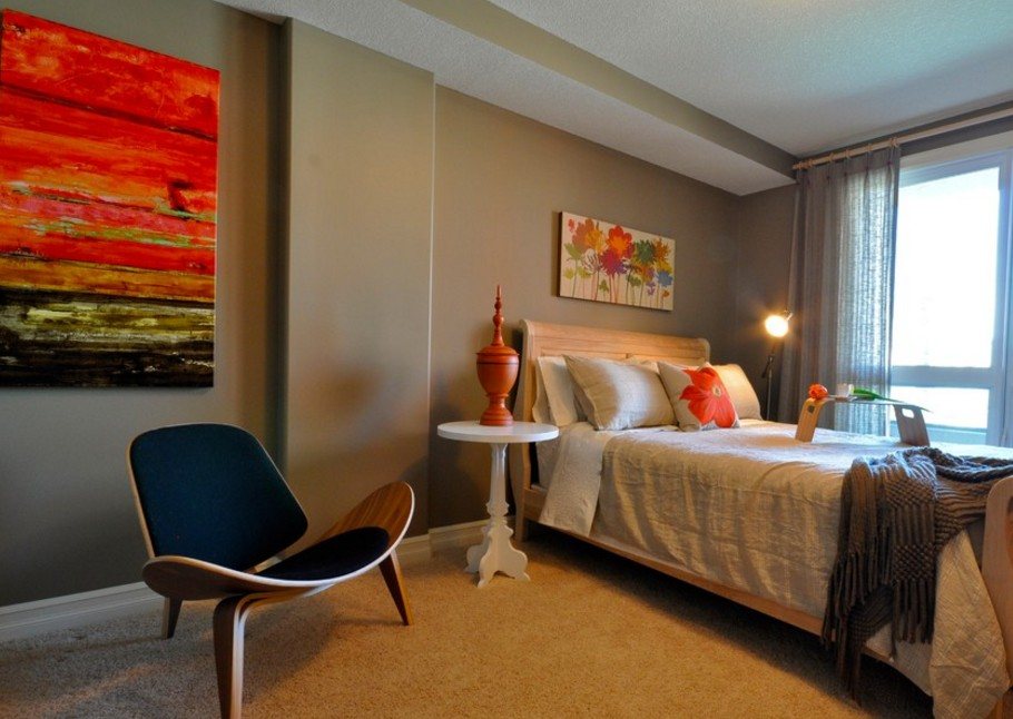 Яркие элементы в комнате для сна необходимы для оживления пастельных стен и напольного покрытия. Наличие цветных картин, текстиля или аксессуаров добавят красок и избавят помещение от излишней строгости.
