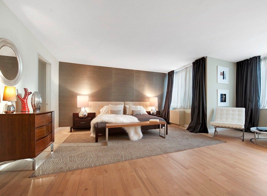 - Пол в современной спальне — ламинат или паркет в 90% случаев, 10% наливные, бетонные, ковролин и т.д.