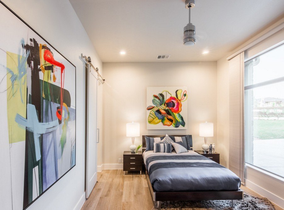 Интересным визуальным цветовым решением является использование в дизайне современного интерьера белого цвета совместно с черным или темно-коричневым. Также отлично смотрится темный пол со светлыми стенами. Не забывайте и о настенных декоративных элементах, среди которых может быть цикл небольших картин, развешанных над кроватью, или разнообразные фотографии. Очень хорошо будет смотреться абстракция и простые сюжеты.