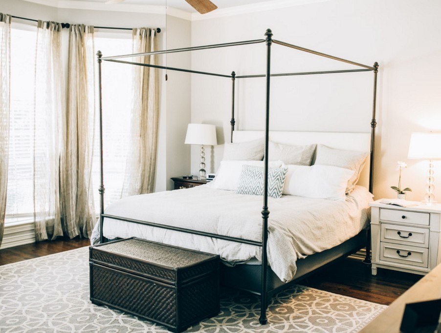 Предвкушая вопрос — нет, это не будет выглядеть неуютно. Это очень простое правило: отделка с прямоугольными правильными формами, смягчение и плавные линии за счёт текстиля, штор и мягкой мебели, которых в спальне хоть отбавляй.