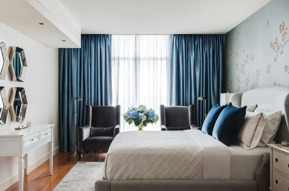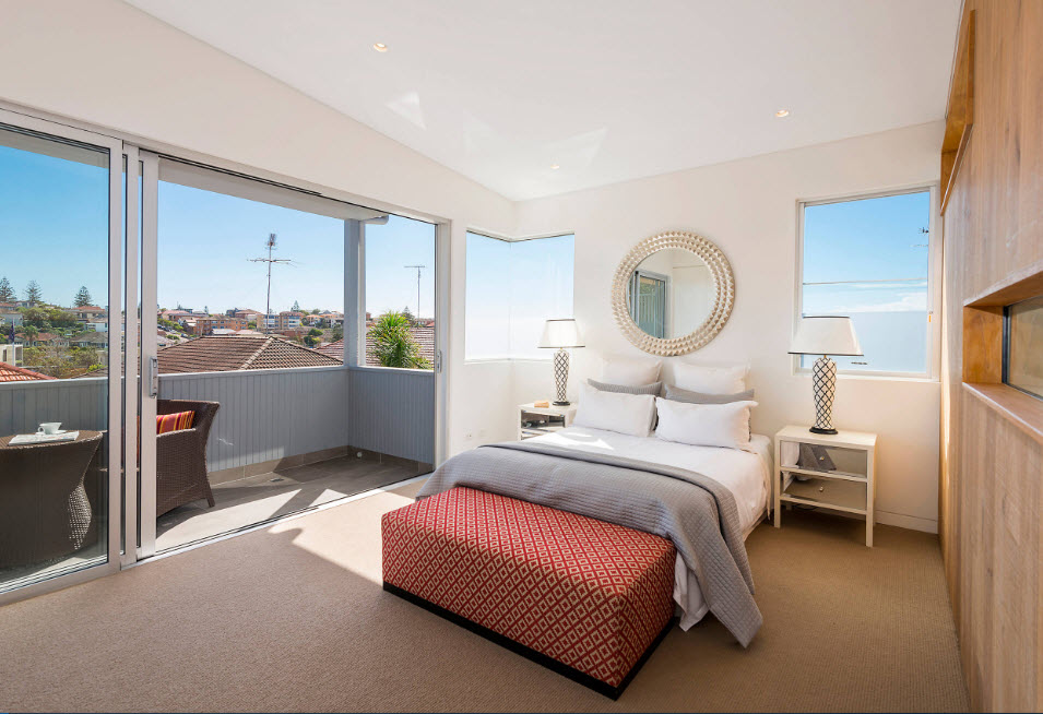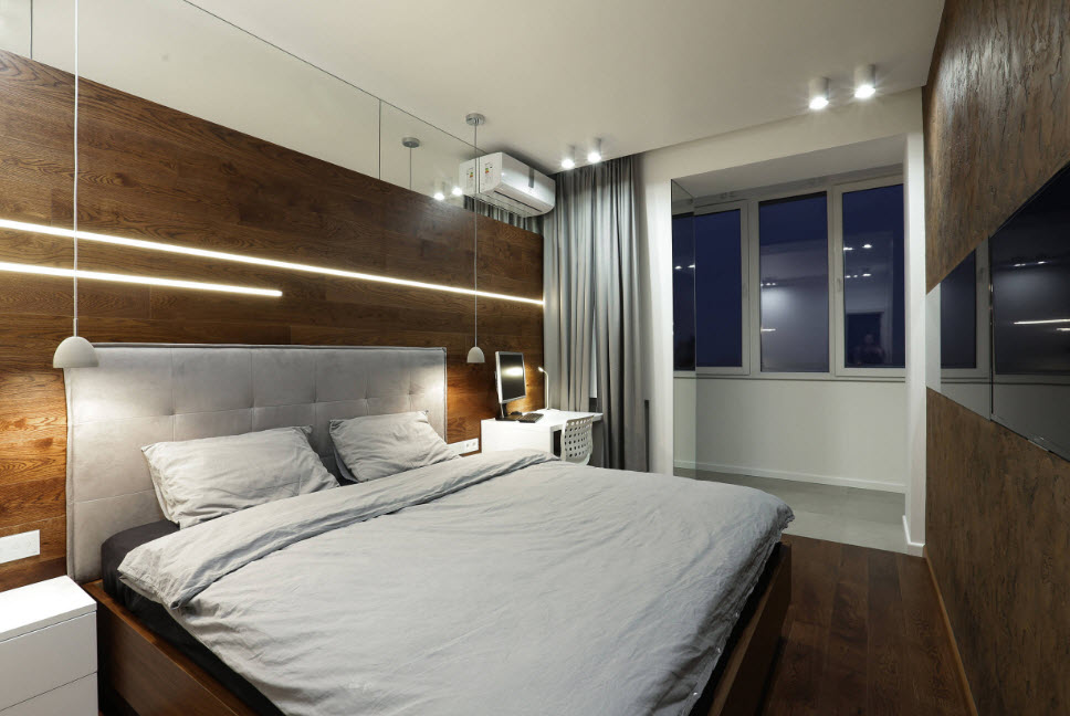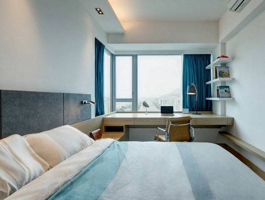 Что касается окон, то их в длинной спальне может быть несколько или же только одно. В комнате с одним окном все просто, ведь мебель располагается в независимости от его размера и расположения, а вот в помещении с двумя окнами нужно отталкиваться от их типа и места, что вызывает дополнительные трудности. Если спальная комната имеет доступ к лоджии, то нужно постараться их объединить, увеличив пространство за счет сноса стены. Утеплив помещение можно создать в полученном пространстве зону для хранения вещей, рабочий стол или гардеробную.