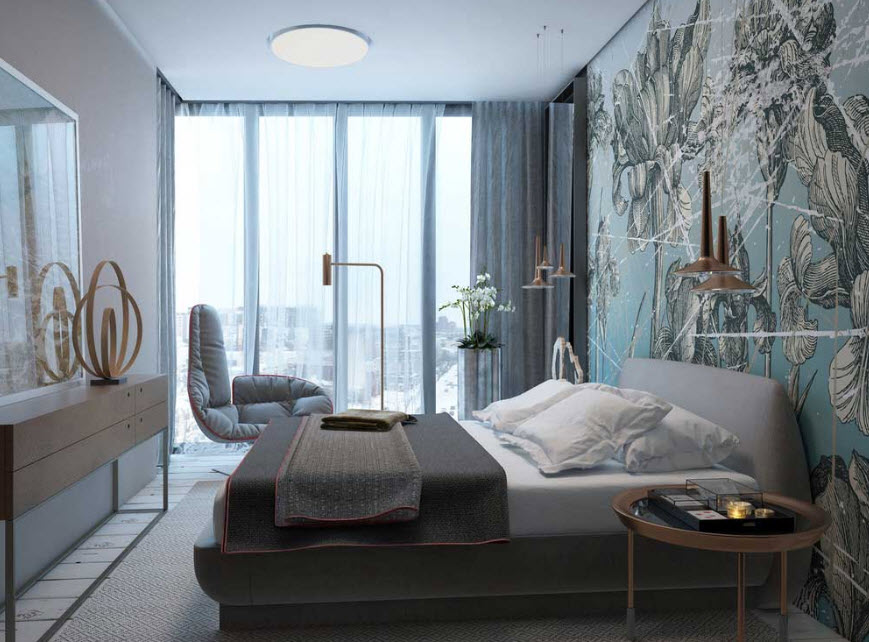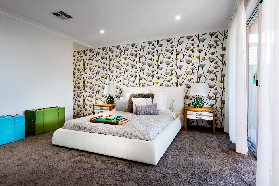 Выбирайте для спальни обои с неброским и мелким рисунком. Крупные цветы и орнаменты сделают небольшую комнату визуально меньше. Хотите сделать акцент в виде выразительных материалов? Оклейте обоями с ярким принтом только одну стену или ее часть, например, в изголовье кровати.