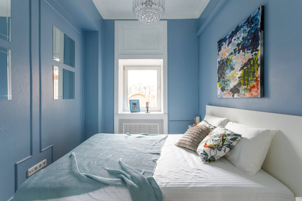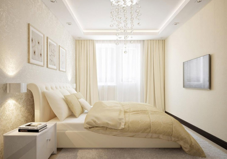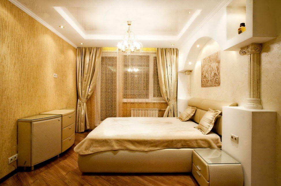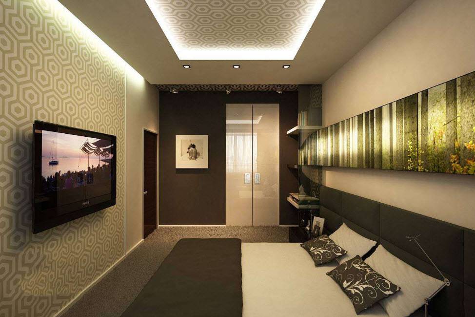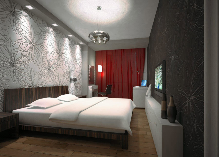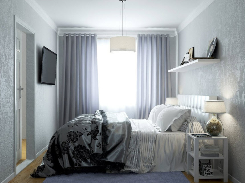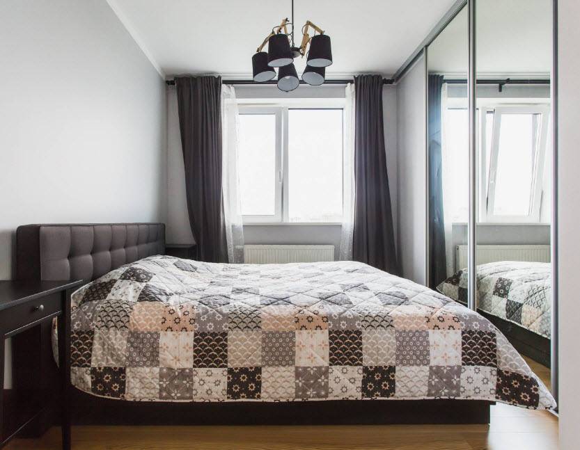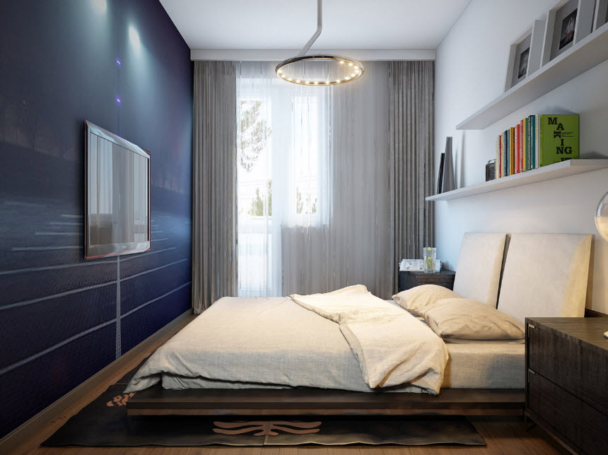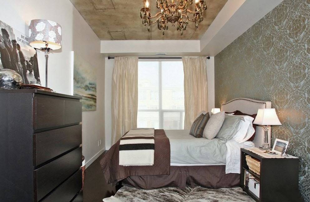 Даже владельцам прямоугольных спален приходится сталкиваться с трудностями. Узкое пространство сложно обустроить, так как вся мебель обычно располагается вдоль одной стены, а другая остается пустой, чтобы не загромождать проход. В результате часть площади, которой и так остро не хватает, остается неиспользованной. Как правило, такие удлиненные спальни вмещают только функциональный минимум: шкаф, кровать и пару тумбочек. На противоположную стену сейчас можно повесить плоский телевизор, который не съест лишние метры. Но чаще ее усиленно декорируют, чтобы закрыть пустоту, которая будет бросаться в глаза. Идеальным для оформления подобной комнаты считается стиль минимализм. Как правило, площадь спален в хрущевках не превышает 12 кв.м. В сравнении с просторными студиями, эти помещения больше смахивают на компактное койко-место. Но даже их можно облагородить и полностью вывести «дух» стандартизации. Владельцы однокомнатных квартир, которые затевают перепланировку, нередко под спальню выделяют еще меньше места (около 8 кв.м). Такие крошечные комнаты получаются в результате разделения тех самых прямоугольных помещений. «Располовинить» их вдоль не представляется возможным, поэтому получается две комнаты квадратной формы. К сожалению, окно в них всего одно и не факт, что его решат оставить именно под комнату отдыха. В таком случае придется грамотно поработать над многоуровневым освещением, которое полностью заменит естественное.
