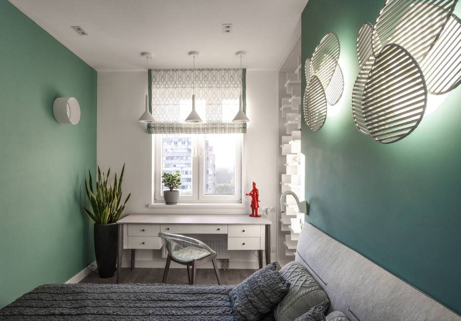 При наличие в комнате небольшой кровати, пространство можно разбить на функциональные зоны. Спальное место можно разместить в глубине помещения, а у его изножья установить банкетку с журнальным столиком ― получиться уютная зона для отдыха, чаепития, чтения.