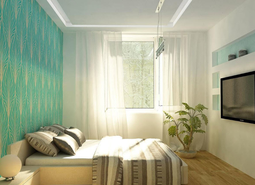 Маленькие спальни в хрущевке, фото демонстрирует оформление окна легкими шторами