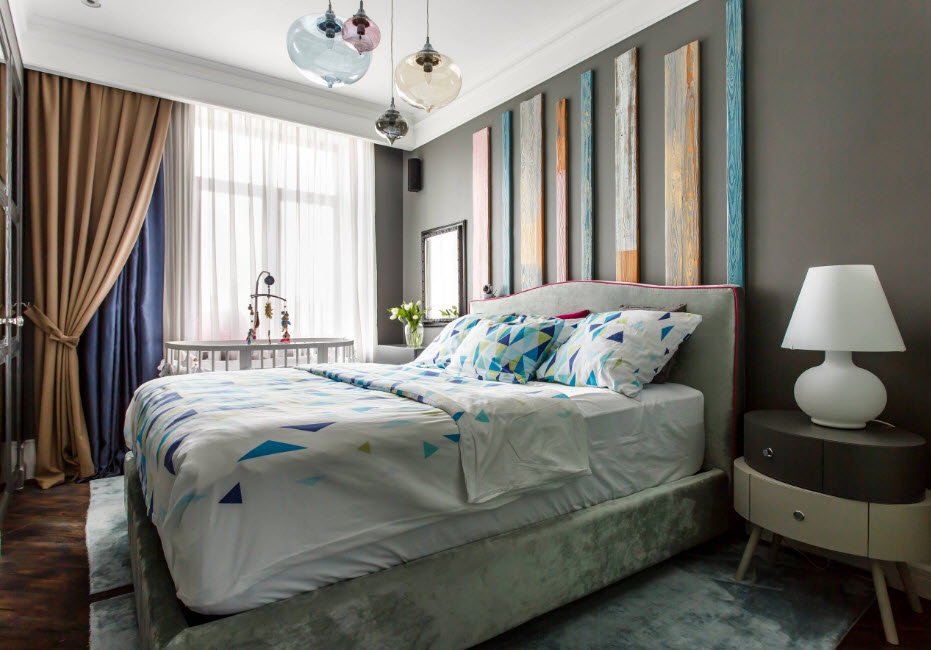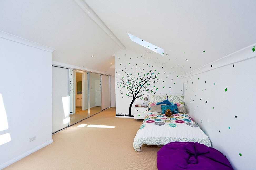 Абсолютно обоснованным решением станет использование преимущественно светлых оттенков, особенно в детской. Светлая однотонная отделка даст возможность декорировать спальное место текстилем с принтом. Такой же узор можно использовать для оконных занавесок.