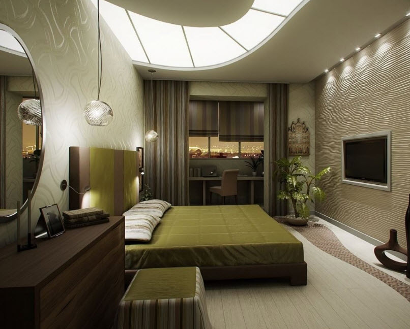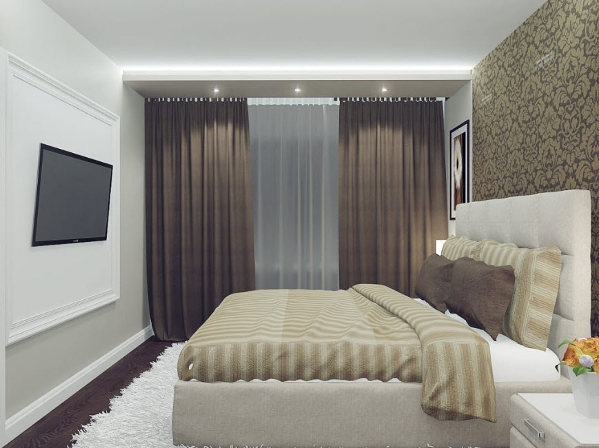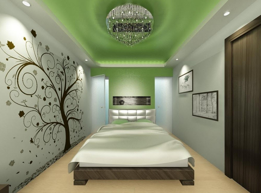 Низкий потолок оптически приподнимется, если сделать его белым, кремовым или светло-бежевым, по периметру наклеить галтель шириной 25-50 мм и заложить за нее диодную подсветку. Глянцевый натяжной потолок так же создаст ощущение, что спальня в хрущевке стала выше. Здесь можно использовать не только белое, но и цветное полотно, и даже черное, например, для хайтека. Если потолок в спальне в хрущевке будет с рисунком, то в остальной отделке лучше придерживаться монохромности.