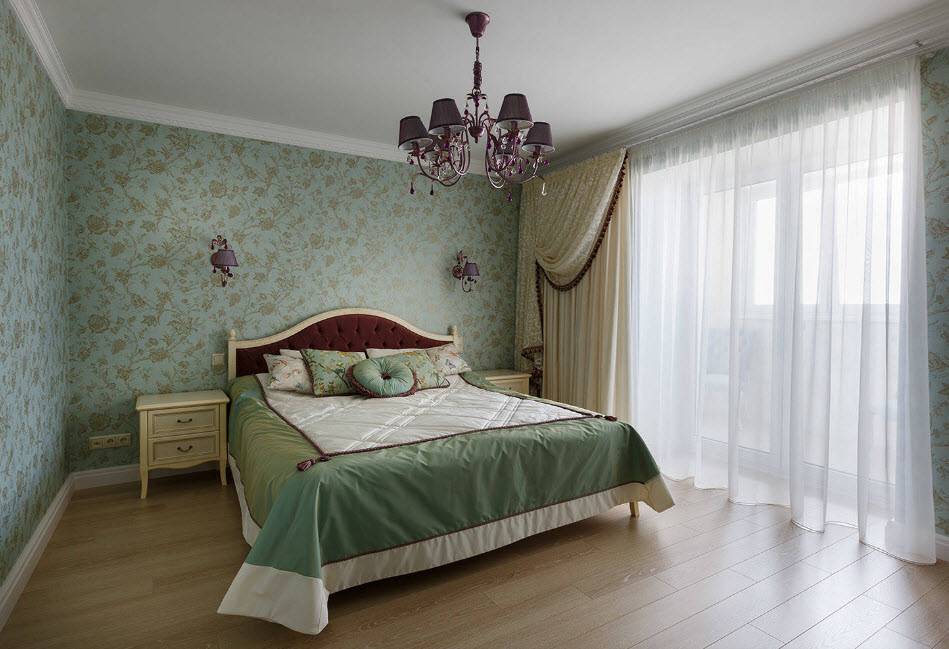 - для стилей кантри, прованс, некоторых направлений классики для стен спальни в хрущевке потребуются обои в цветочек, лучше в мелкий, или полотно с орнаментом в тон основе, при таком решении в отделке мебель должна быть простой и лаконичной, либо очень изящной, кованной или резного дерева белого или натурального медового оттенка.