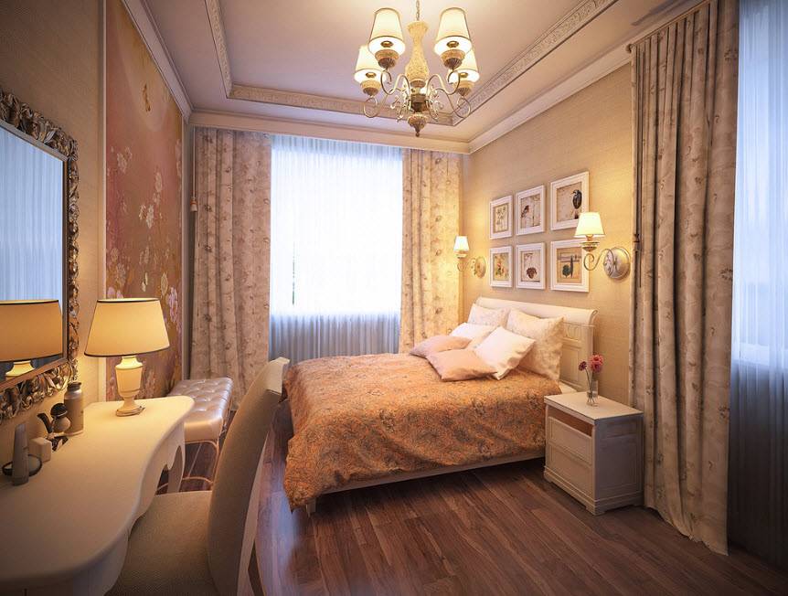 - 8-10 кв. м. В таких спальнях требования к мебельному минимуму еще жестче: одна кровать и туалетный столик, рабочее место, две тумбочки или узкий шкаф на выбор. Предпочтение отдают тому интерьерному объекту, в котором возникает большая необходимость.