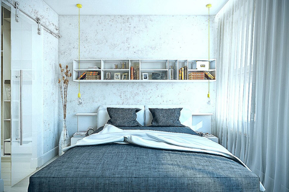 Чтобы сэкономить место прикроватные тумбочки можно заменить полкой, расположенной над изголовьем кровати или между кроватью и стеной.