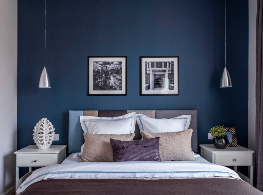 - Синие тона. Глубокий синий цвет дарит спокойствие и помогает быстрее расслабиться. Насыщенные тона способны создать ощущение глубины и фактурности отделки. Нежные голубые оттенки способствуют созданию атмосферы уюта и умиротворенности.