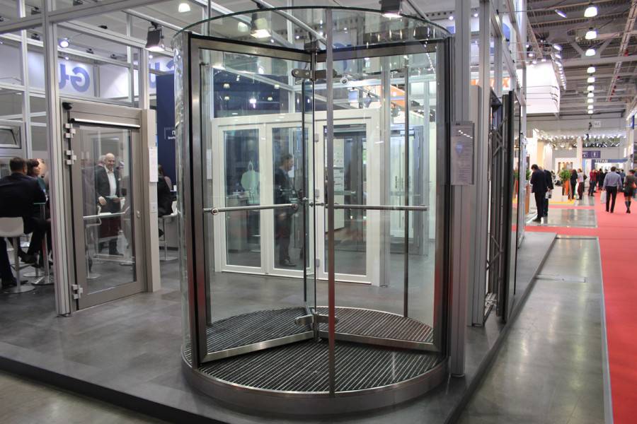 Цельностеклянная круглая карусельная дверь типа GGG с автоматическим позиционированием (представлена в рамках выставки Batimat 2015)