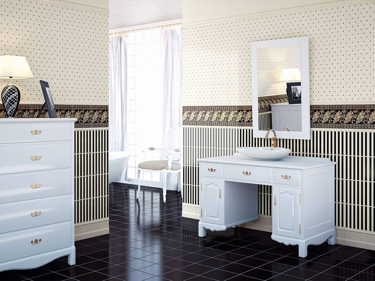 Керамика премиум-класса понравится тем, кто любит аристократизм и роскошь. Эти замечания четко прослеживаются во всех проектных решениях. Кстати, предложение включает не только керамику для стен, но и плитку для пола — керамогранит. А добиться покрытия стен и пола тон в тон очень просто.