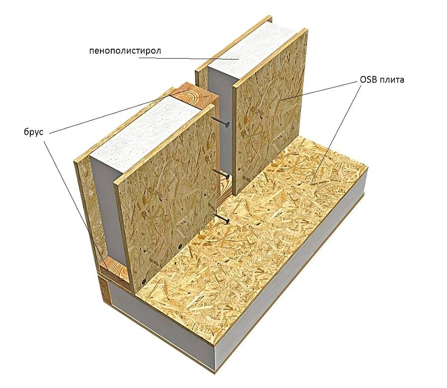 Утеплитель приклеивают под давлением или накачивают в пространство между ОСП. Полученные слоистые панели обладают высокой механической прочностью, устойчивостью к вертикально падающей влаге, низкой теплопроводностью. Плотность пенопласта для наружных элементов – не ниже 25 кг/м³.