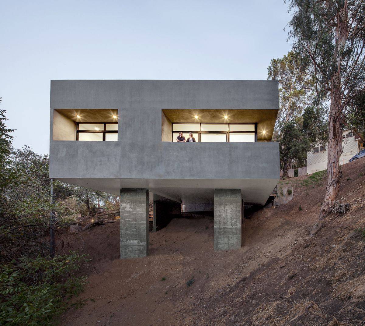 Верхний объём дома консолью нависает над патио. Опорой дома является сварная конструкция. Основание под ней укрепили с помощью 40 свай, вбитых в каменистый грунт на шестиметровую глубину.