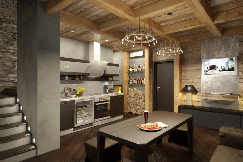 - Если высота потолков позволяет, декорируем их деревянными брусьями. Если же нет, то можно просто присмотреть декоративные накладки в виде деревянной обрешетки.
