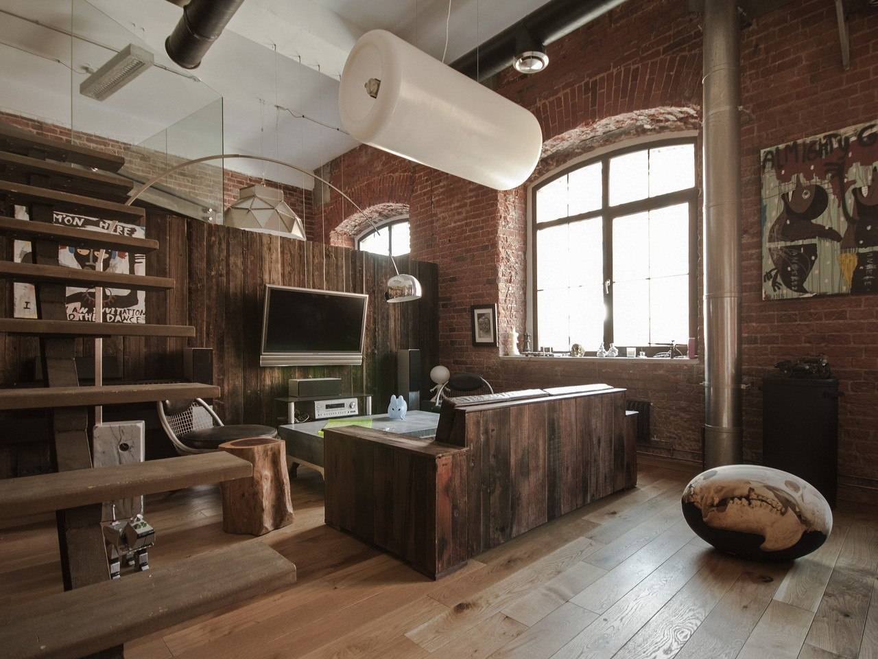 Стиль предполагает имитацию незавершенности ремонта, естественные материалы, наличие характерных для заводского помещения элементов.