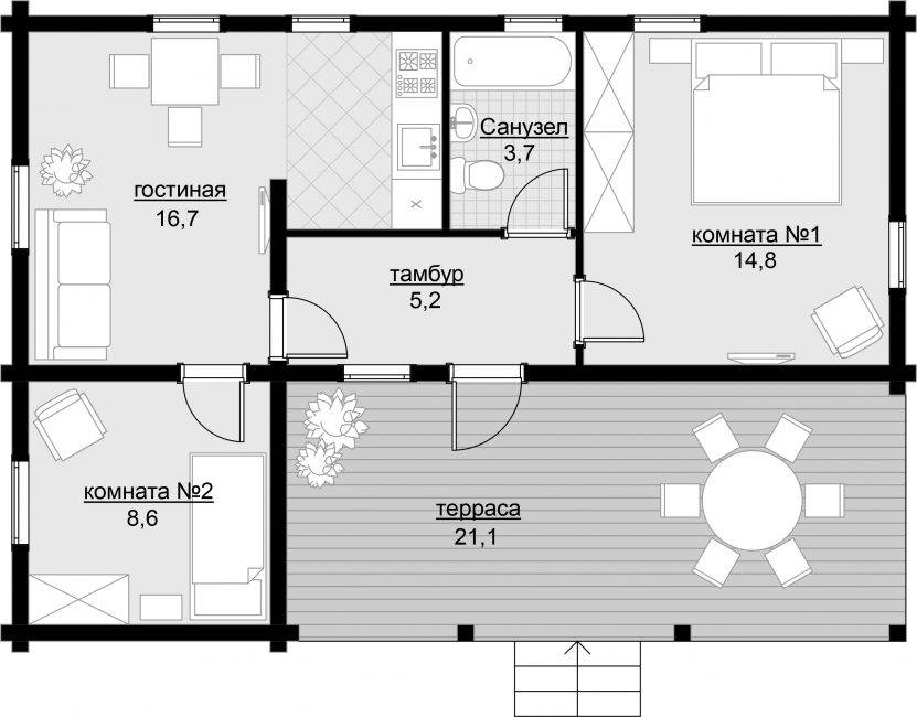 По данному проекту можно построить дом, идеально подходящий для отдыха большой компанией. Изюминкой является просторная терраса площадью 21 м2. Тут без труда поместится обеденный стол, и даже уютную зону отдыха с мягкой мебелью можно будет организовать. При желании около обеденного стола или вместо него можно поставить несколько шезлонгов и прекрасно проводить время, вдыхая чистый загородный воздух и попивая коктейль. В общем, вариантов масса, но главное, что на террасу можно легко попасть из совмещенной кухни-гостиной. Если надумаете устроить обед или ужин на свежем воздухе, все тарелки и приборы можно будет быстро перенести. Небольшую зону хранения можно организовать в посторном тамбуре. Есть на первом этаже и место для топочной, так что дом можно использовать и для зимнего отдыха, и даже для постоянного проживания. Нашлось место тут и для небольшой спальни, рядом с которой разместился санузел.