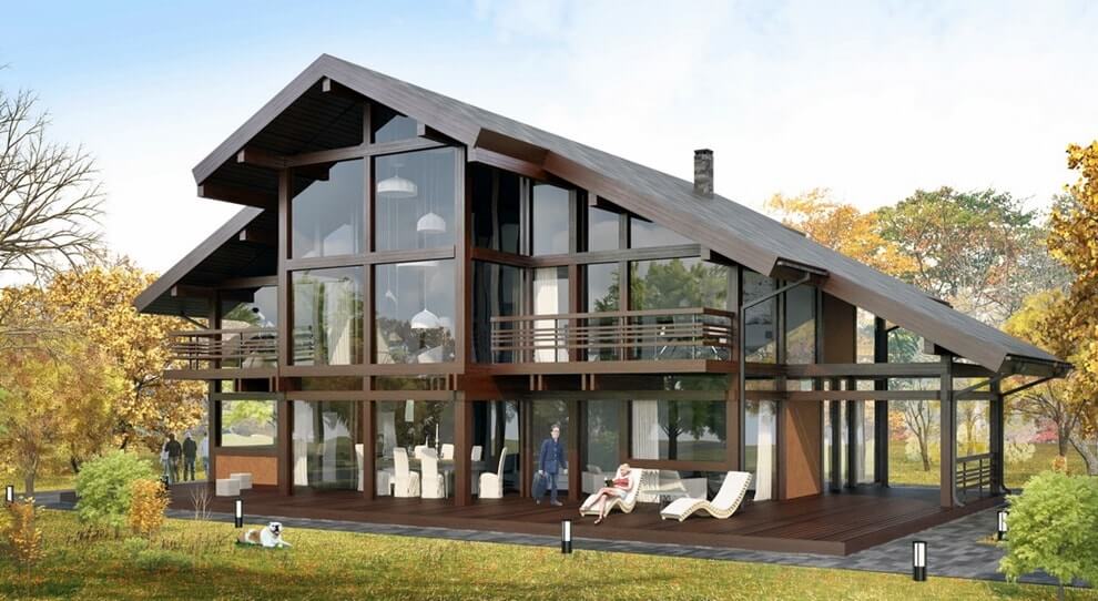 - Остекление. Допускается застекление 70% дома, вместо заполнения. При правильном подборе материалов в здании будет комфортно жить в любой сезон;