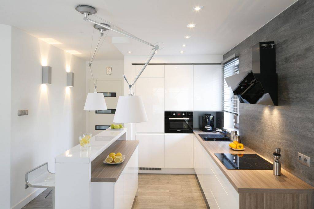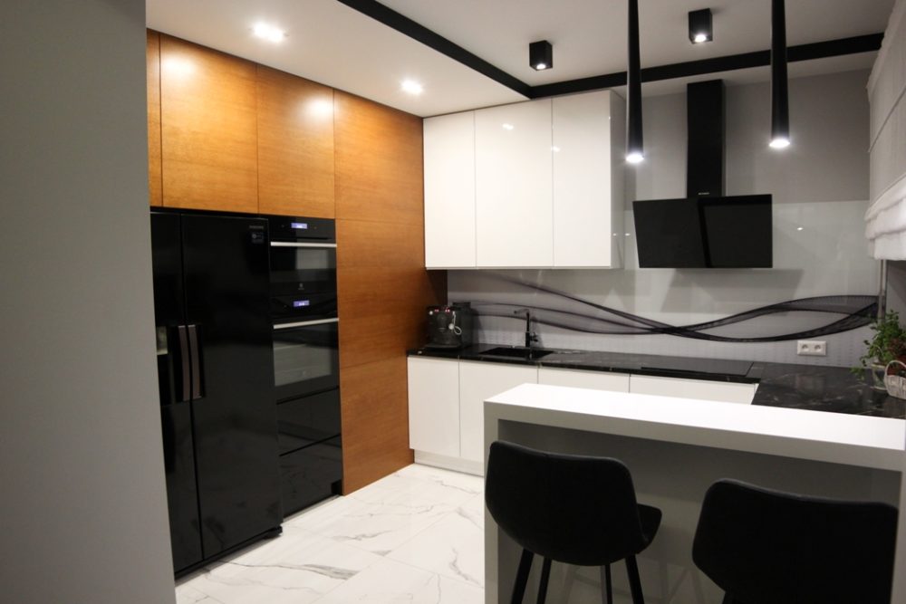 - Угловая кухня с барной стойкой. В этом случае совмещаются обеденная и рабочая зоны, чаще всего они имеют разную высоту, но при этом выполнены в едином стиле. Очень удобно, если на одной из стен расположено большое окно или же когда перегородка между балконом и кухней частично демонтируется.