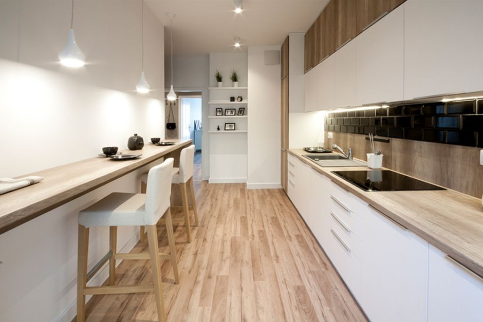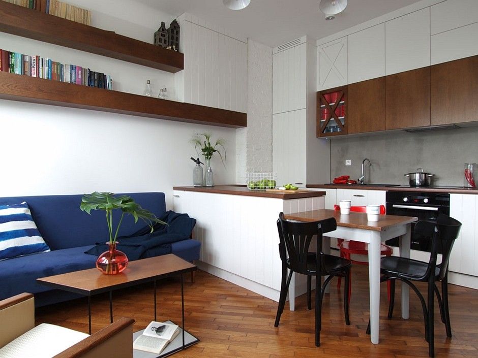 - Откажитесь от части дорогостоящих навесных шкафов, разбавив их полками и удобными и вместительными столами.