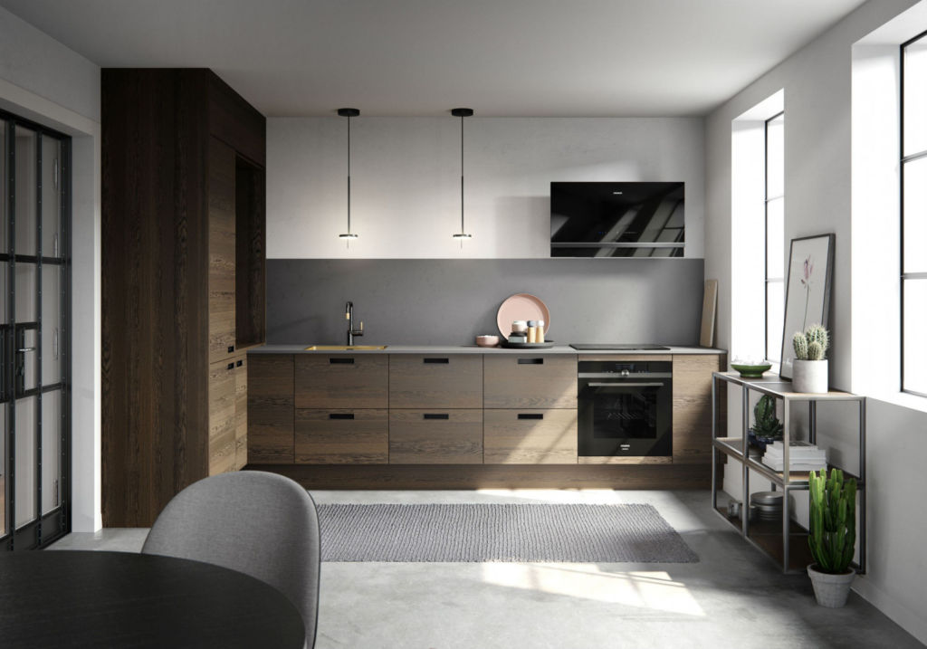 Вместе с модой на стиль лофт, на кухню пришла мебель с фасадами из стали, алюминия или даже бетона (специальные смеси позволяют производить доски небольшой толщины и веса).