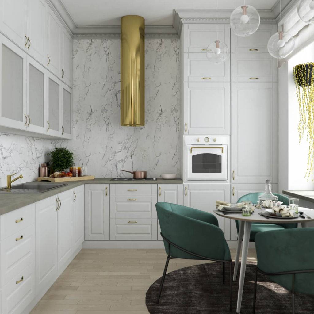 В этом случае мы рекомендуем скорее пастели, которые возвращаются в пользу кухонных композиций в стиле 70-х годов. Однако, если у вас большая площадь, мы рекомендуем выбирать мебель с зелеными фасадами и классическими ножками. Двери со стеклянными фасадами должны быть закреплены на верхних шкафах, за которыми посуда будет красиво смотреться.