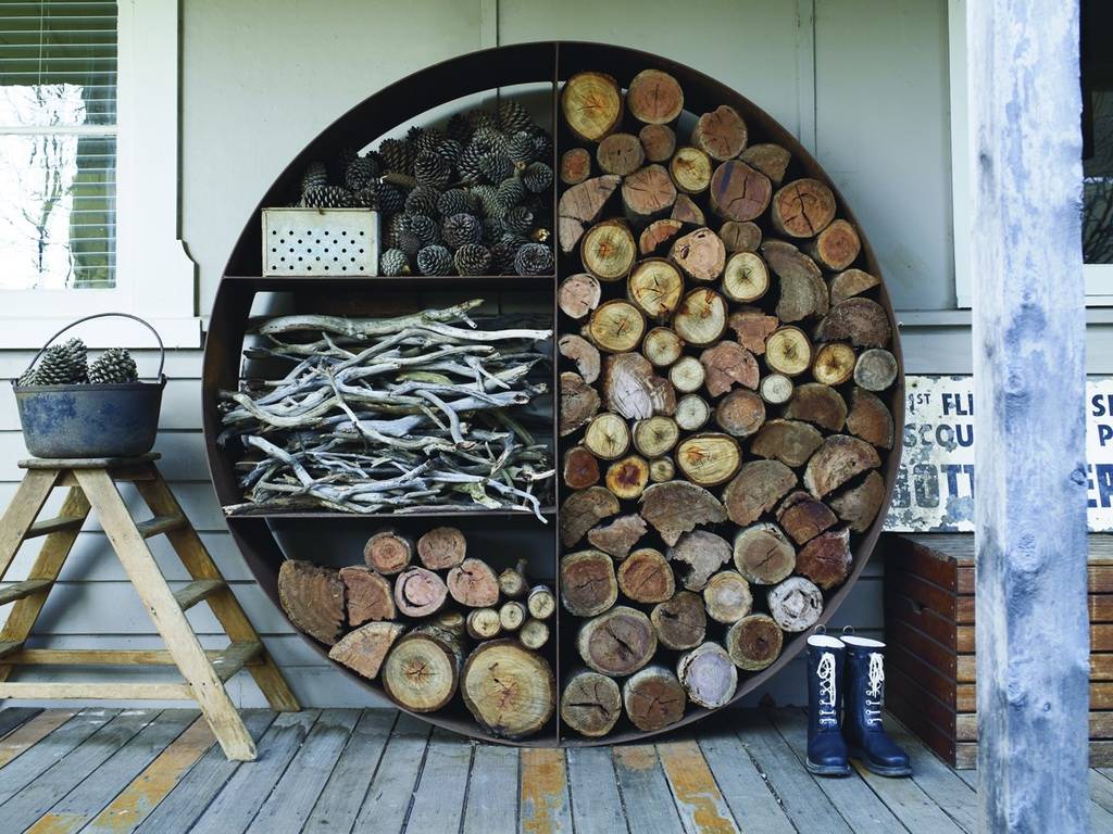 К такому стилю хорошо подходят кубические деревянные дровницы или в виде стеллажа. Они могут быть отдельно стоящие, или подвешенные на стене. Их можно сделать самим и окрасить в цвет остальной мебели.