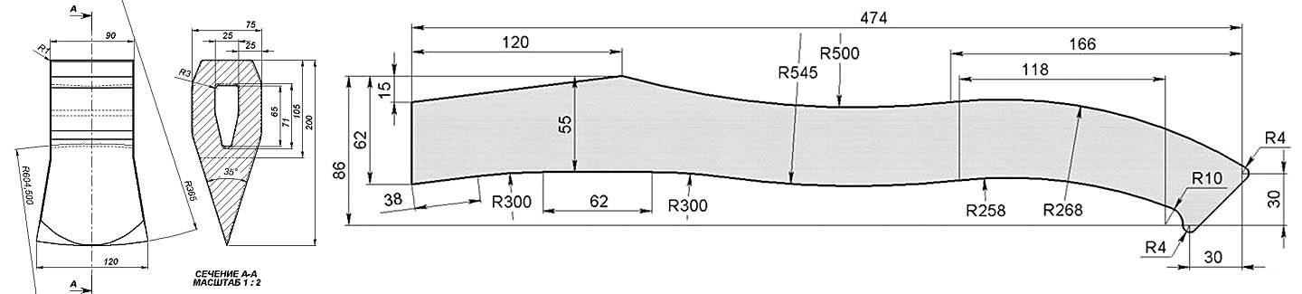 Топор-колун прошел длительную эволюцию и продолжает совершенствоваться. Справа на рис. дан чертеж колуна Стрела, приспособленного для ручной колки суковатых и свилеватых кряжей; слева – топорища для него (колун на нем крепится клином). С топорищем как хотите, нравится вам махать топором или нет, а вот самый колун нам еще очень пригодится, см. далее.