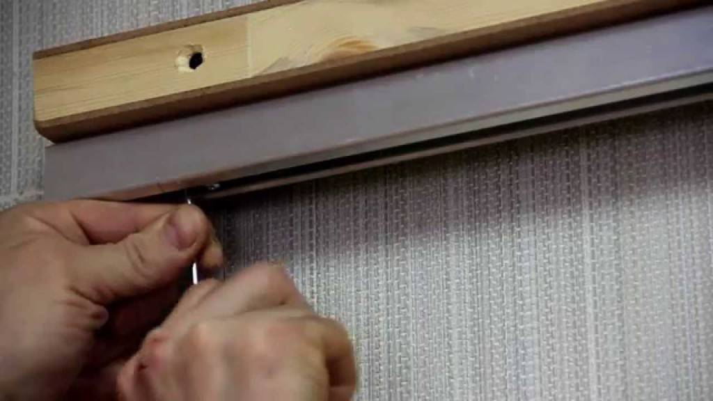 Для монтажа верхней направляющей к стене над проемом посредством болтов крепится брус. Его положение определяется с помощью дверного полотна, которое (с заранее закрепленными роликами) устанавливается в нижнюю полосу. Карандашом помечается высота двери, к которой добавляется 7 мм.