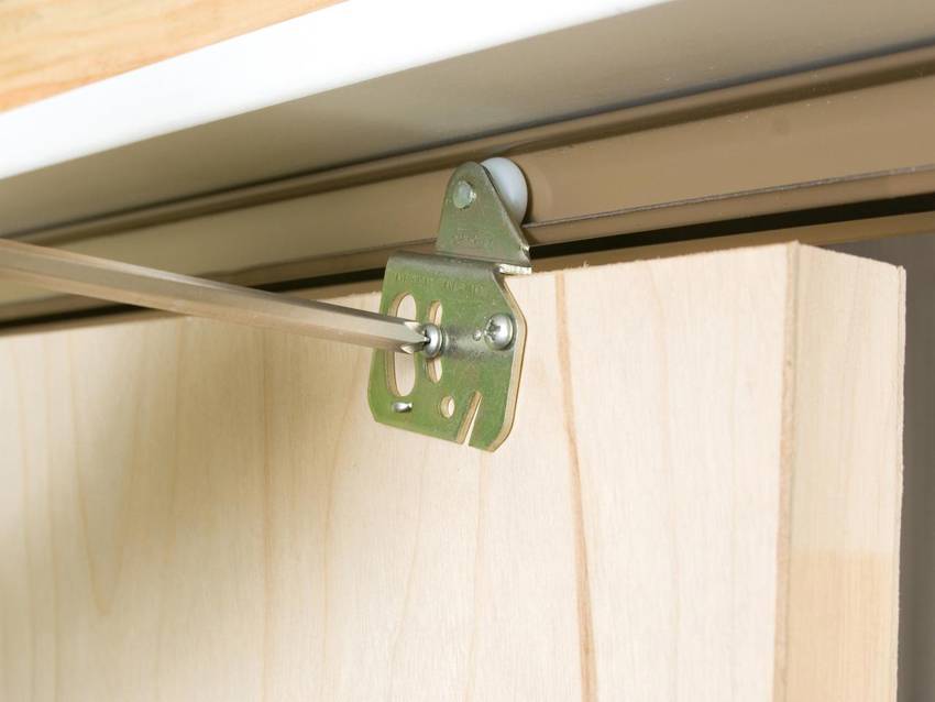 Удобство одной направляющей рельсы в том, что не будет вечно мешающего порога. С другой стороны, нагрузка на нее значительно повысится, а значит и износ будет больше. Также можно расположить одну сверху, а другую снизу. Этот вариант куда лучше, но устанавливается такая дверь сложнее и дольше. Постоянное использование приводит к повышенному износу, поэтому крепиться рельсы должны на шурупы. Также из крепежных изделий используется дюбель и кронштейн (последний нужно выбирать именно для такого типа дверей). Сам процесс может показаться незамысловатым, но важно внимательно следить, чтобы направляющие всегда оставались в ровном положении: иначе придется все переделывать заново. Подробнее о видах креплений написано ниже. Далее нужно установить каретки. Они включают в себя ролики и скобу. Последнюю нужно убрать. Затем роликовый механизм вставляют внутрь рельс. Перед тем, как повесить полотно, обязательно прикрепите к нему все необходимые и желаемые элементы. В ином случае вам попросту будет неудобно. Затем можно наконец прикрепить сами полотна. Все, что нужно сделать – скрепить части каретки между собой. Особенности данной процедуры могут различаться в зависимости от модели. Как правило, инструкцию можно найти в упаковке или на сайте производителя. Учитывайте, что закрепить створки в одиночку весьма проблематично: лучше найти того, кто поможет зафиксировать полотно.