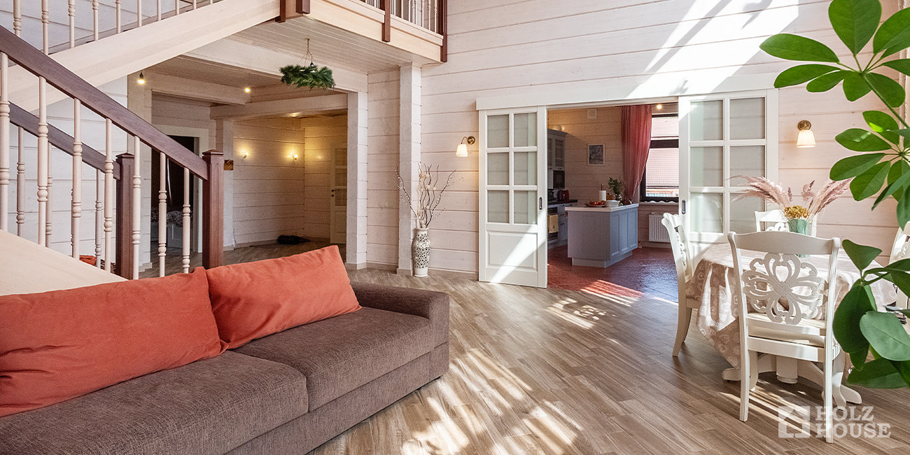 Современный стиль в деревянном доме подчеркнет остекление дверных полотен. Стекло может быть матовое, прозрачное, витражное, любой формы и размера. Популярен раздвижной механизм открывания.