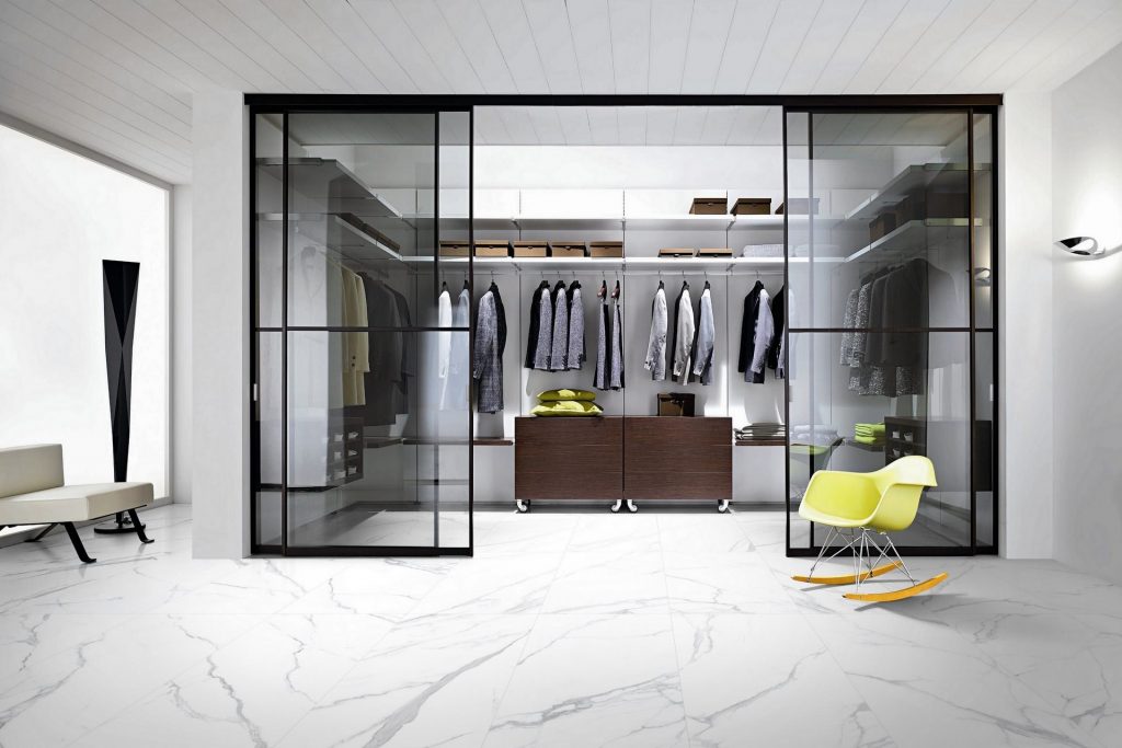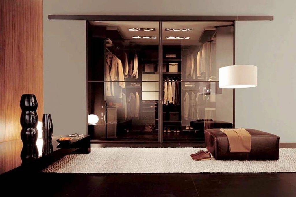 Выбор двери в гардеробную в основном будет зависеть от площади помещения. В серой, маленькой и тесной комнате понятно, что нужны легкие конструкции. В этом случае можно выбрать конструкцию стеклянной двери (полупрозрачную или непрозрачную).