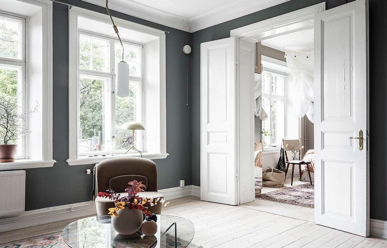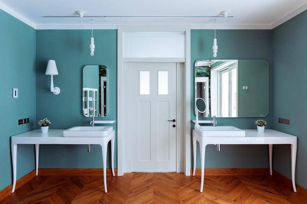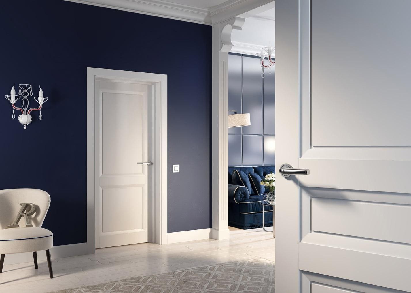 Более яркие и насыщенные цвета стен — синий, бордовый, пурпурный — белые двери визуально смягчают и смягчают, без необходимости цветовой терпимости. Подобные сочетания встречаются как в классических, так и в современных интерьерах — неоклассицизма, модерна, хай-тек. Также приветствуются лишние белые элементы на стенах или возле них в этих стилях — это могут быть светлые плинтусы, белые окна, видимые или просматриваемые