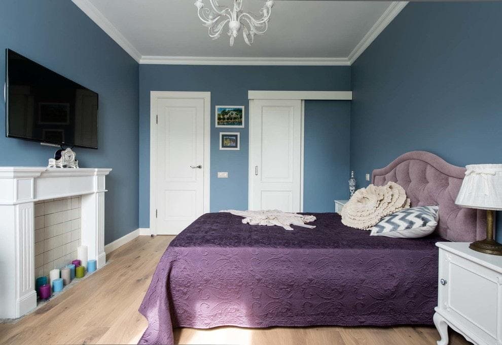 - Для отдыха и релакса применяют сочетание голубого, синего в интерьере комнаты с белыми дверями.