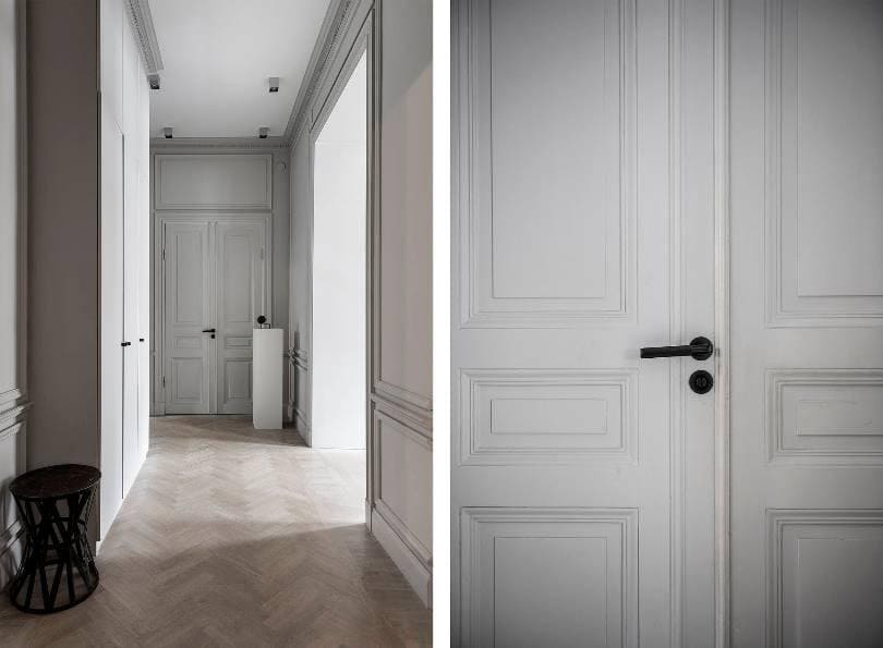Кроме того, белый цвет двери в темном интерьере можно сохранить с помощью аналогичных оттенков мебели или полов. А темноту черных стен можно сыграть с любопытным фактом отделочного материала — например, обоями, — или с небольшой краской, с матовой