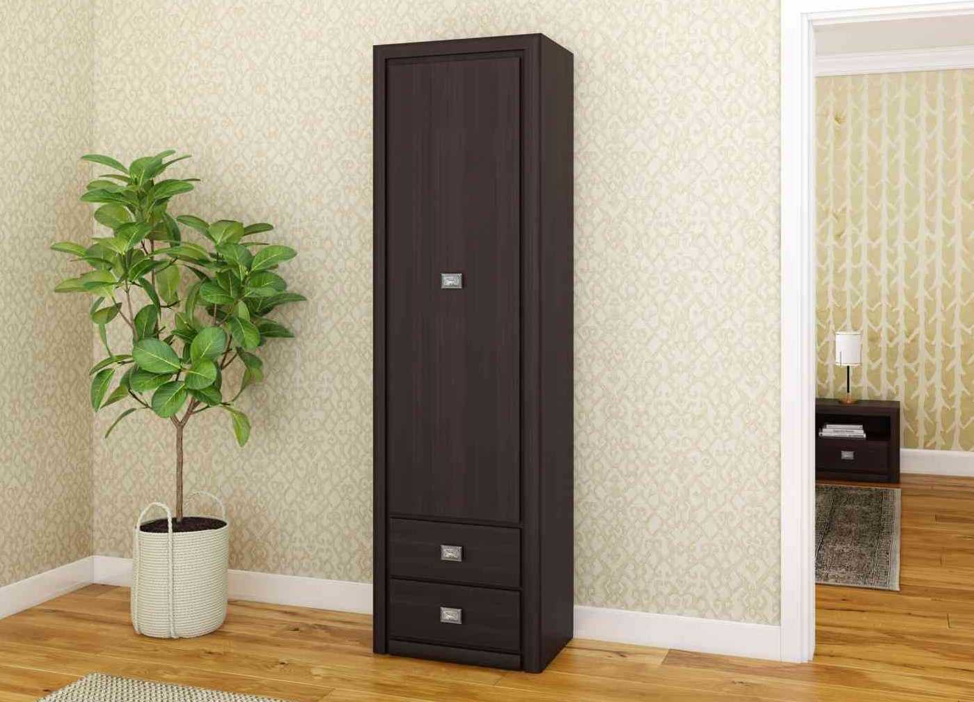 Однодверный шкаф чаще всего ставят в небольшие комнаты, поскольку он имеет скромные габариты. У такого предмета мебели предусмотрено только распашное открывание. Его еще называют несессер или пенал. Здесь хранят минимальный набор одежды на каждый день. Он снабжен небольшим количеством полок и штангой для вешалок.