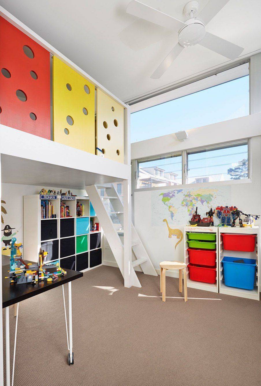 Высокий потолок сталинки позволит организовать в детской двухэтажную игровую конструкцию