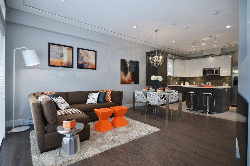 Объединенный дизайн двухкомнатной квартиры превращает гостиную, кухню и столовую в одну зону