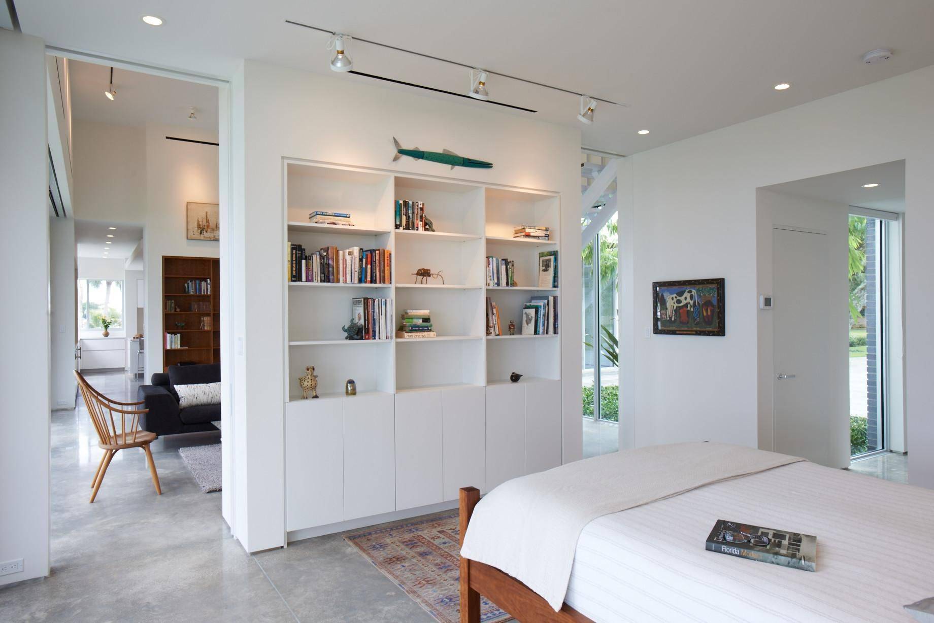 В квартире-студии нет стен, их роль выполняют перегородки и стеллажи